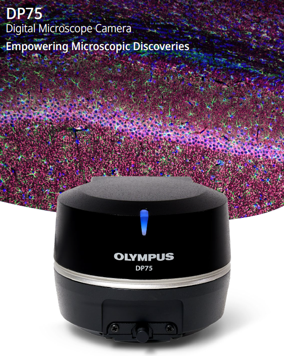 The DP75 digital microscope camera is a high-performance, multi-application imaging tool that makes it easy to capture high-resolution brightfield or fluorescence images using a single camera.